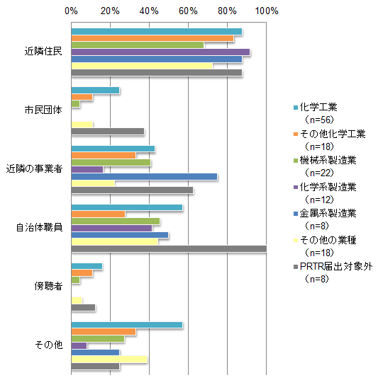 化学工業で「市民団体」や「傍聴者」の参加を得ている割合が他の業種に比べて大きくなっていて、より多くのステークホルダーをコミュニケーション対象として捉えているようです。これは、化学工業が業界団体としてリスクコミュニケーション活動に積極的に取り組んでいるため、組織だって様々なステークホルダーと交流していることが関係していると考えられます。