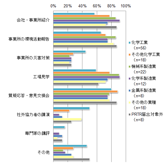 化学工業は、業界団体が中心となった合同開催が多いことから、個別事業所の詳細についてはプログラムに盛り込まず、外部の専門家を活用した公開性、中立性のあるコミュニケーション活動に重点を置いているためと考えられます。