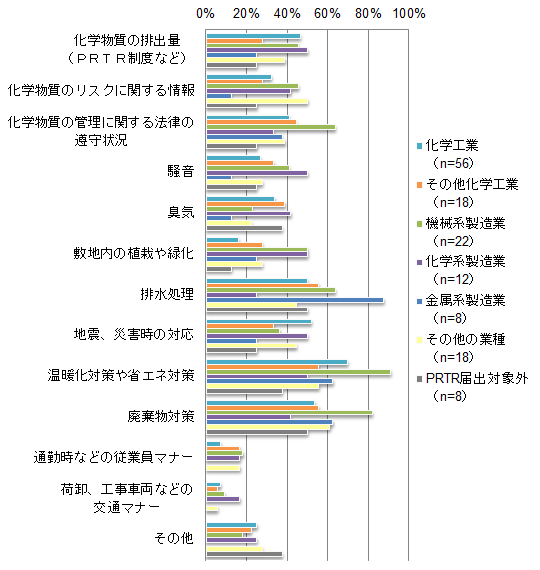 リスクコミュニケーション活動の場での情報提供は「温暖化・省エネ対策」「廃棄物対策」「排水処理」に重点が置かれています。化学工業が「化学物質に関すること」を積極的に説明しているといったことはなく、化学物質に関する内容は「臭気」や「騒音」といった生活公害の要因と同程度でした。