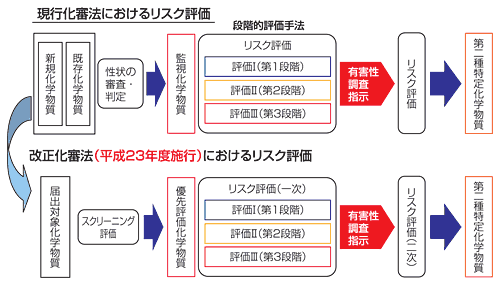 2009年5月に公布された改正化審法では、「既存化学物質」まで、規制の対象に加え、さらにリスク評価に基づく化学物質管理が強化されました。この度の改正により、製造、輸入量や有害性に係るこれまでの知見から、優先的にリスク評価を行う必要がある化学物質(優先評価化学物質)を指定し、収集された有害性情報等によるリスク評価結果から、その程度に応じて必要な規制措置を講ずることになりました。
