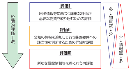 - :化審法の届出情報と公知の有害性情報を用いた評価により、多数の化学物質から、評価II以降の詳細な評価が必要な化学物質を絞り込む