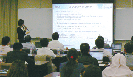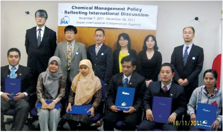 2011年度は、JICAが主催しベトナム、インドネシア、カンボジアから6名の政府関係者が参加した研修「国際的な化学物質管理に対する国内制度の対応」、財団法人海外技術者研修協会(AOTS)が主催しアジア6か国から29名の政府・企業関係者が参加した「アジア化学物質リスク評価手法研修コース」及び財団法人海外貿易開発協会(JODC)が主催しタイ、ベトナム及びマレーシアで計6回のセミナーが行われた「化学物質リスク評価手法専門家派遣セミナー」などの事業が実施されました。