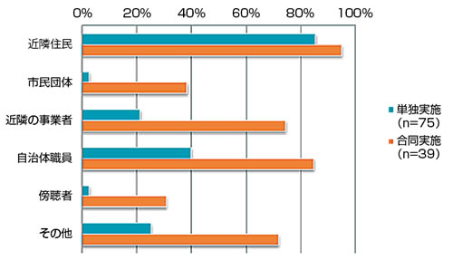 合同実施では、事業者と近隣住民の他、「市民団体」、「近隣の事業者」、「自治体職員」など幅広いステークホルダーの参加を得て開催している傾向があります。組織的に活動することにより、幅広い対象との交流が可能になっています。また、地元の大学や高校生の参加を積極的に促している事例もあります。