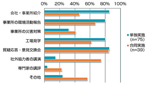 一方、合同実施では時間も限られている関係で、「会社・事業所紹介」、「事業所の環境活動報告」、「工場見学」など事業所ごとの活動内容の説明時間が少ない傾向にあります。しかし、「社外協力者の講演」、「専門家の講評」の割合が単独実施より高いことから、外部からの情報提供を受けることで、幅広い視点で情報提供しつつ、公開性や中立性を担保していると考えられます。