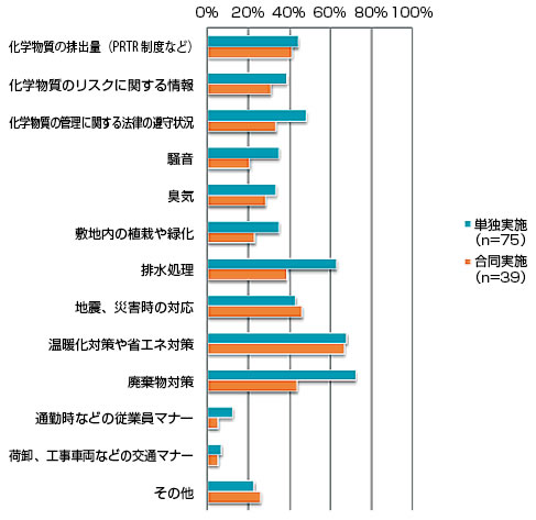 一方、近隣住民の関心を反映する質問項目については、「地震、災害時の対応」が63%(両実施方法の合計)と最も高く、東日本大震災の影響で、近隣住民の関心が高くなっている可能性があります。次いで「温暖化対策や省エネ対策」37%、「臭気」34%、「排水処理」31%。「化学物質のリスクに関する情報」31%と安全や生活環境への関心が高い傾向にあります。