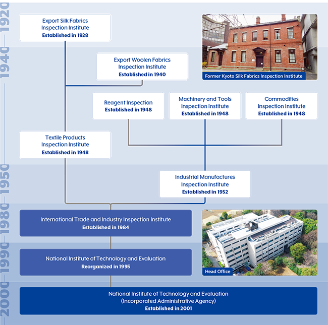 Established in 1928, NITE originally served as the Export Silk Fabrics Inspection Institute, and conducting quality inspections of silk textiles. Inspection facilities for various industrial products were also established later. In the 1970s, we expanded into services related to product safety and work based on the Industrial Standardization Act. In the 1980s, we began handling safety assessments of chemical substances. In the 1990s, we entered the field of biotechnology and became an accreditation body, accrediting conformity assessment bodies. In October 1995, we were reorganized as the National Institute of Technology and Evaluation.