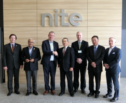 写真中央、握手を交わすIEC会長JoCops氏とNITE理事長谷川史彦