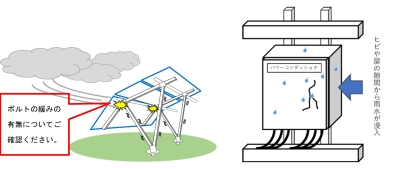 - ・集電箱、パワーコンディショナ、キュービクル等の屋外電気設備を点検し、外郭に亀裂や破損など隙間がある場合には、雨水の浸入を避けるため、穴を塞ぐなどの措置をとってください。