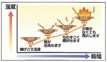 天ぷら油は、強火で加熱すると約5~10分程度で自然発火する温度(370℃以上)に達します。