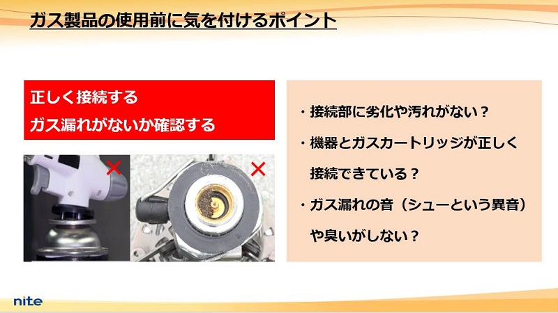 ○製品とガスカートリッジの接続部に劣化や汚れがないかを確認する。