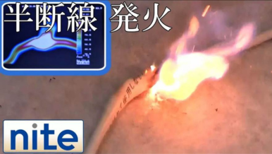 ⇒ この電源コードの断線部分が壁とテーブルの脚に挟まれた位置にあったことから、繰り返し外力が加わったために電源電線が断線し、スパーク(火花)が発生し火災に至ったと推測されました。