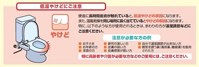便座の蓋裏や取扱説明書には、「長時間使用する時は便座温度を切にする。切以外の設定で長時間使用すると低温火傷のおそれがある。」旨、記載されていました。