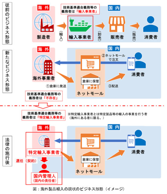海外事業者がインターネットモール等を利用するなどして、「消費生活用製品安全法等の規制対象製品(PSマーク対象製品)」を国内の輸入事業者を介さず国内消費者に直接製品を販売する場合、当該海外事業者を消安法等において届出を行える対象として明確化するとともに、規制の執行を担保すべく、当該海外事業者に対し、国内における責任者(国内管理人)の選任・届出を求めます。