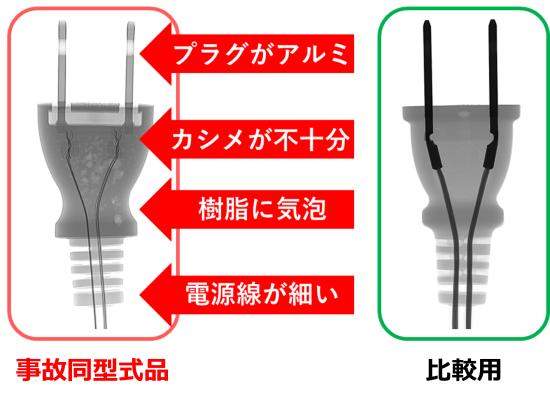 →設計に問題があり異常発熱した事故です。電源プラグ栓刃がアルミニウム製で電気用品安全法の基準を満たさない材質であり、配線カシメ部が強度の低い構造であったため、カシメ部付近で異常発熱が生じ、焼損したものと推定されます。