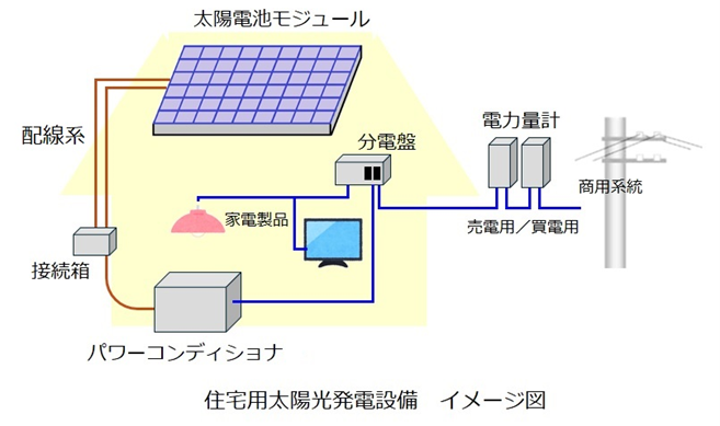 太陽光で発電された電気(直流電気)を商用電源と同じ交流電力に変換し、ブレーカーを通してAC100Vを家屋内に流します。余剰電力を電力会社に売電するための制御もここで行われます。