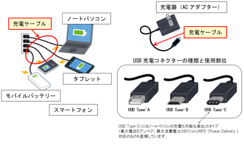 対象のUSB充電コネクターは、主にノートパソコンやタブレット・スマートフォン等のデジタル機器やそれらを充電するための充電器(ACアダプター)・充電ケーブルに備わっているものを対象としています。