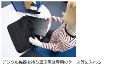 ノートパソコンやタブレットなどのデジタル機器にはリチウムイオン電池が内蔵されています。リチウムイオン電池は傷や変形により発熱するため、落下しないよう気をつけることはもちろん、万が一に備えて専用のケース等に入れて持ち歩いたり保管したりしましょう。