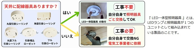 天井に引掛シーリングなどの配線器具が取り付けられていれば、基本的に工事は不要で、LED照明に照明器具ごと自分で交換することができます。もし天井に配線器具がない場合や、別の形式の取り付けられていれる場合は、電気工事業者に工事を依頼する必要があります。