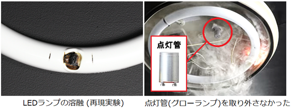 →グロースターター式の蛍光灯器具に LED ランプを装着する際、点灯管(グローランプ)(※4)を取り外さなかったため、点灯時に過電流が流れて異常発熱し、LED ランプを焼損したものと考えられます。