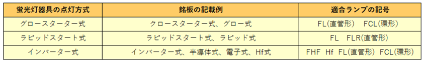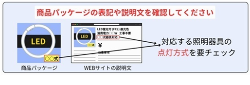既設の照明器具のまま蛍光ランプを LED ランプに交換する際は、必ず「蛍光灯器具側の点灯方式」と「LED ランプ側の対応点灯方式」が合っていることを確認してください。「蛍光灯器具側の点灯方式」は、点灯管の有無や銘板の記載を確認することで調べることができます。「LED ランプ側の対応点灯方式」は、商品パッケージや説明文を確認することで調べることができます。