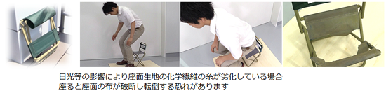 →事故製品は、日常的に直射日光の当たる場所において、高い頻度で使用されていました。日光等の影響により座面生地の化学繊維の糸が劣化して脆弱化していたため、当日の使用での荷重により座面生地が破断し事故に至ったものと考えられます。