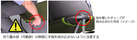レジャー用折りたたみ椅子やベッドなどは、使用時や組み立て時に折りたたみ部(可動部)の隙間に手指を挟んでけがをするおそれがあります。組立ては確実に行いましょう。また、子どもと一緒のレジャーなどでは、子どもが不意に可動部を触ったり、可動部に手指を入れたりすることがあるため、注意を払いましょう。