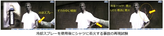 冷却スプレーにも可燃性ガスが含まれています。冷却スプレーを使用した後に、近くでライターやこんろを点火しないでください。可燃性ガスに引火し、着衣に着火するおそれがあります。
