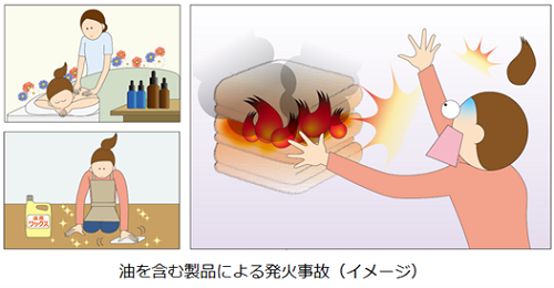 ※1 油を含む製品とは、例えばエステ店等でオイルマッサージの際に使用されるようなアロマオイルやマッサージオイル、清掃時に使用される床用ワックス、他には塗料等のような、成分に油を含む製品のことです。