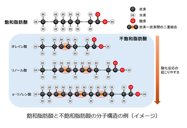 飽和脂肪酸は分子構造の中に炭素―炭素間の二重結合(以下、二重結合)を含まない脂肪酸、不飽和脂肪酸は二重結合を含む脂肪酸を指します。