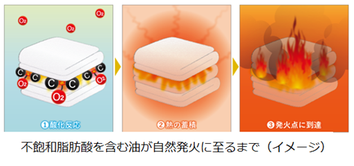 不飽和脂肪酸を含む油は外部の火種がなくても油自らが発熱し、最終的に発火に至ることがあります。これは、不飽和脂肪酸が持つ二重結合が空気中の酸素に触れることで酸化反応が起こり、発熱し、この発熱反応が繰り返されることで熱が蓄積し、やがて発火点(※3)に至るためです。