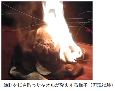 →塗料は、不飽和脂肪酸を多く含む植物油(えごま油)を主成分としたもので、拭き取ったウエスと枯れ草を同じビニール袋に入れて長期間(7日)放置したため、植物油の酸化熱(※2)が蓄熱されて自然発火に至ったものと考えられます。