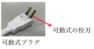 →壁コンセントに差し込まれていた延長コードの可動式プラグ付近でコードが曲げられた状態で使用されていました。当該部分に曲げ応力が加わり、両極の栓刃可動部付近が変形・破損し、異常発熱して焼損したものと考えられます。『電源プラグ』が変形して異常発熱した事故です。