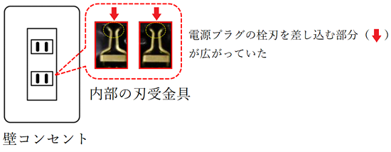→食器洗い乾燥機の電源プラグが接続されていた壁コンセントの刃受金具の間隔が広がっていたため、栓刃と刃受金具との間で接触不良が生じて異常発熱し、焼損に至ったものと考えられます。『コンセント』が緩んだ状態となったため接触不良が発生した事故です。