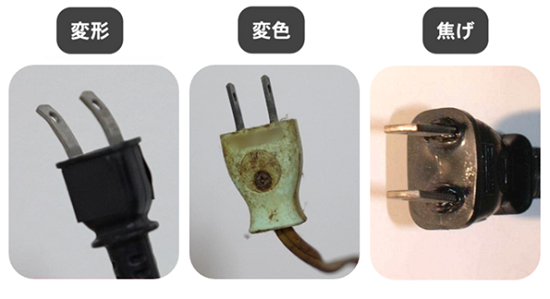 電源プラグが変形、焦げが認められる場合や電源プラグが異常に熱くなっている場合は使用を中止し、メーカーや販売店に相談しましょう。