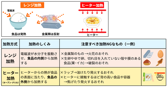 多機能タイプの電子レンジには、大きく2種類の加熱方式があります。「レンジ加熱」は電磁波(マイクロ波)で食品の内側から温める方式で、「ヒーター加熱」はヒーターからの熱で食品の外側から焼き上げる方式です。加熱方式を誤ると、発煙や発火などの事故につながるおそれがあります。