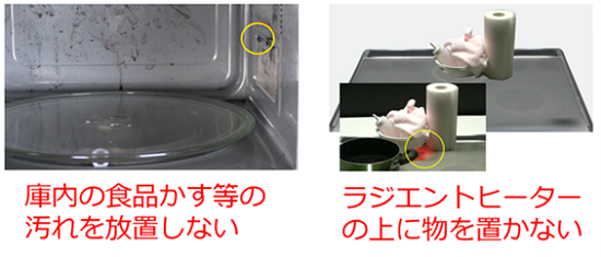 調理家電はこまめに掃除を行ってください。電子レンジは庫内やドアの内側に食品かすなどの汚れが付着した状態で使用すると、炭化してスパーク(火花が発生)し、発火するおそれがあります。IHこんろは、IHヒーターの上でカセットボンベや缶詰等を誤って加熱すると破裂するおそれ、ラジエントヒーターの上で可燃物を誤って加熱すると発火するおそれがあります。調理器具以外のものはトッププレートの上に置かないようにしましょう。