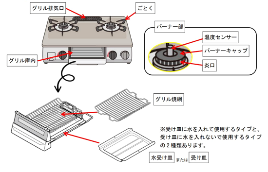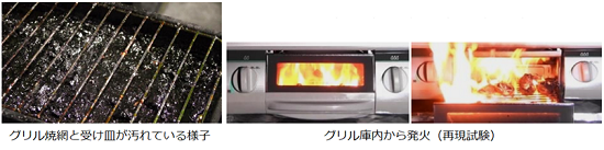 →ふだんから「グリル水入れ皿」に水を入れずに使用していたため、グリル内に多量の油脂等が堆積していました。こんろを使用中、誤ってグリルも一緒に点火したため、グリルの燃焼が継続して油脂等に着火したものと考えられます。