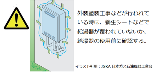 ・外壁塗装工事などが行われている時は、工事作業の養生シート、養生テープで給排気口が塞がれていないか、給湯器の使用前に確認しましょう。