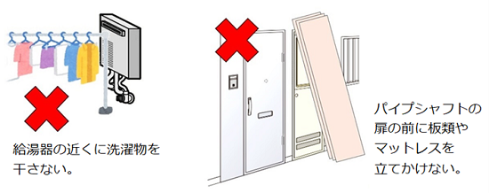 洗濯物などを外干しされる時は、ガス給湯器の近くには干さない。ベランダのスペース が限られている場合も、可能な限り給湯器付近に干すことは避けましょう。