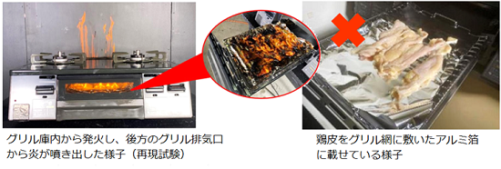 ガスこんろのグリルを使って鶏皮を調理中に、グリル排気口から火が出る火災が発生しまた。(2022年 東京都 年齢不明女性 被害なし)