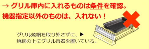 グリル庫内に入れるものは必ず取扱説明書で条件を確認し、機器指定以外のものは入れないようにしましょう。