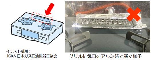 グリル排気口は、グリル庫内の煙や熱を外に逃がすためのものです。臭いの拡散や汚れの付着を防ぐ目的で、アルミ箔などで完全に塞いでしまうと、異常燃焼による一酸化炭素中毒や火災、機器焼損の原因となります。