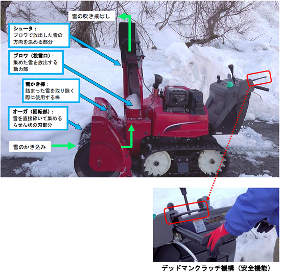 →除雪機のデッドマンクラッチを大きな洗濯ばさみで挟み、安全機能を無効化して除雪機から離れ、オーガ(回転部)に近づいた際に誤って巻き込まれたものと考えられます。