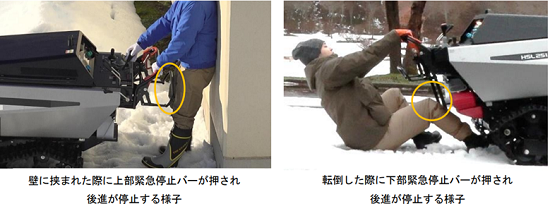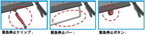 人が挟まれそうになった際などにバーが押されるとクラッチが切れ、機械が停止する安全機能。ハンドル付近に設置される上部緊急停止バーと、足下付近に設置される下部緊急停止バーがあります。