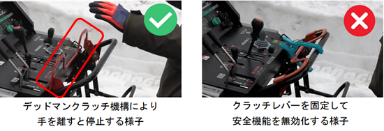 2004 年4月から、除雪機安全協議会加盟メーカーの除雪機(歩行型)においては、デッドマンクラッチ機構を標準装備としています。製品によっては以下のような安全機能も備わっています。