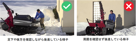 後進する際は、足下や後方の障害物を確認し、十分注意して走行しましょう。転倒して除雪機の下敷きになったり、障害物に挟まれたりするおそれがあります。