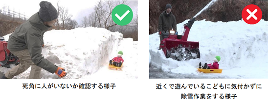 除雪作業をする際は、周囲に人がいないことを確認しましょう。特に背丈の低いこどもは死角に入りやすいので、十分気を付けましょう。また、除雪機のエンジンを掛けたままその場を離れると、こどものいたずらなど、思わぬ事故につながるおそれがあります。