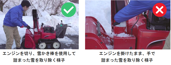 エンジンを掛けたまま雪を取り除く作業を行うと、手を負傷するおそれがあります。雪が詰まった場合は、直接手で行わず、必ず備え付けの雪かき棒を使用して取り除きましょう。