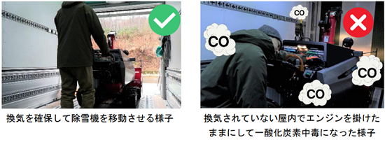 除雪機は始動/停止も含め風通しの良い屋外で使用しましょう。エンジンを切った状態で、手で押して移動できない大型の除雪機等の場合は、窓などの開口部を開放して十分な換気が取れていることを確認してから、「屋内で始動し速やかに屋外に出る」、「屋内にしまったら速やかにエンジンを切る」などの対策をしましょう。