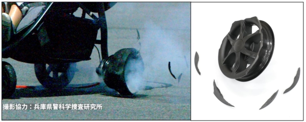 【実験写真】使用者の空気の入れすぎによりタイヤ※1が破裂し、車輪の破片が飛散